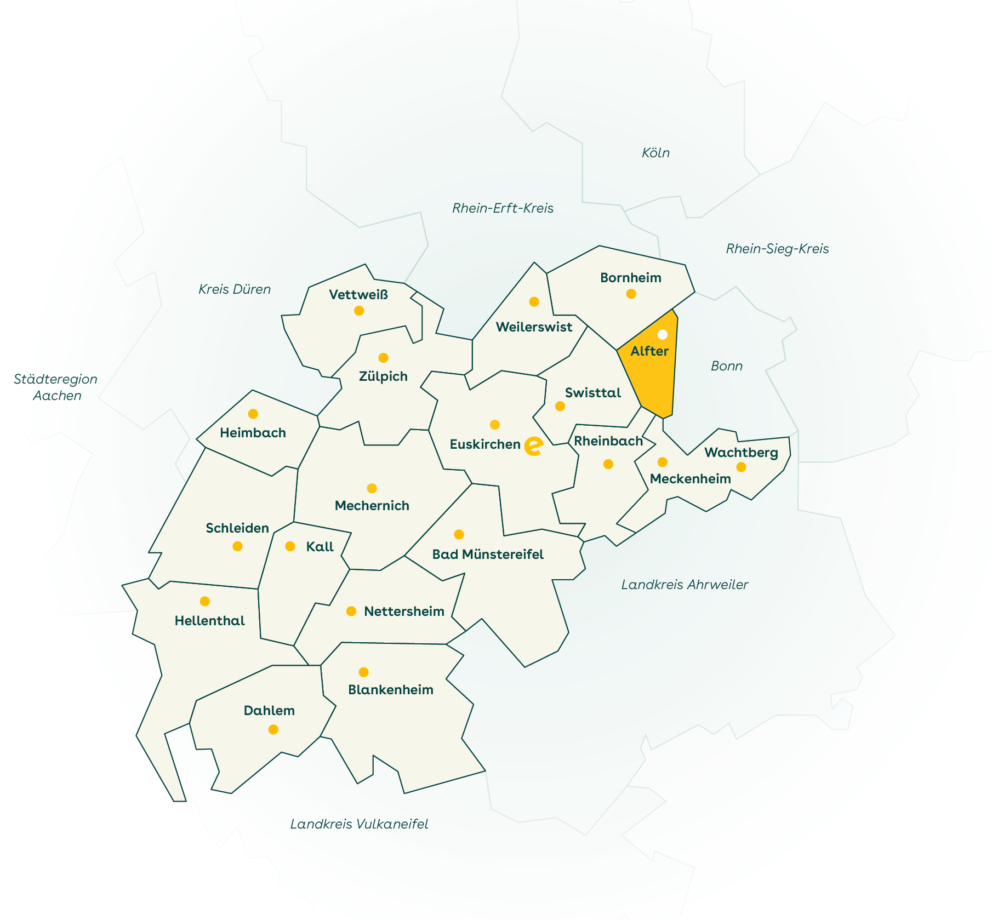 e-regio ist Ihr verlässlicher regionaler Partner für eine Solaranlage in Alfter. In der Region zwischen Rhein und Eifel sind wir seit über 90 Jahren aktiv. In Alfter kümmern wir uns neben dem Thema PV auch um die Betriebsführung der Gemeindewerke Alfter und sind für alle Fragen rund um die Wasserversorgung für Sie da. Außerdem betreiben wir drei E-Auto-Ladestationen. Diese befinden sich auf dem Parkplatz vom Naturhof Wolfsberg (Schnelllader), Am Möthensteeg (AC) und auf dem Parkplatz Zur Ölmühle (AC). Unser Kundencenter befindet sich ganz in Ihrer Nähe.