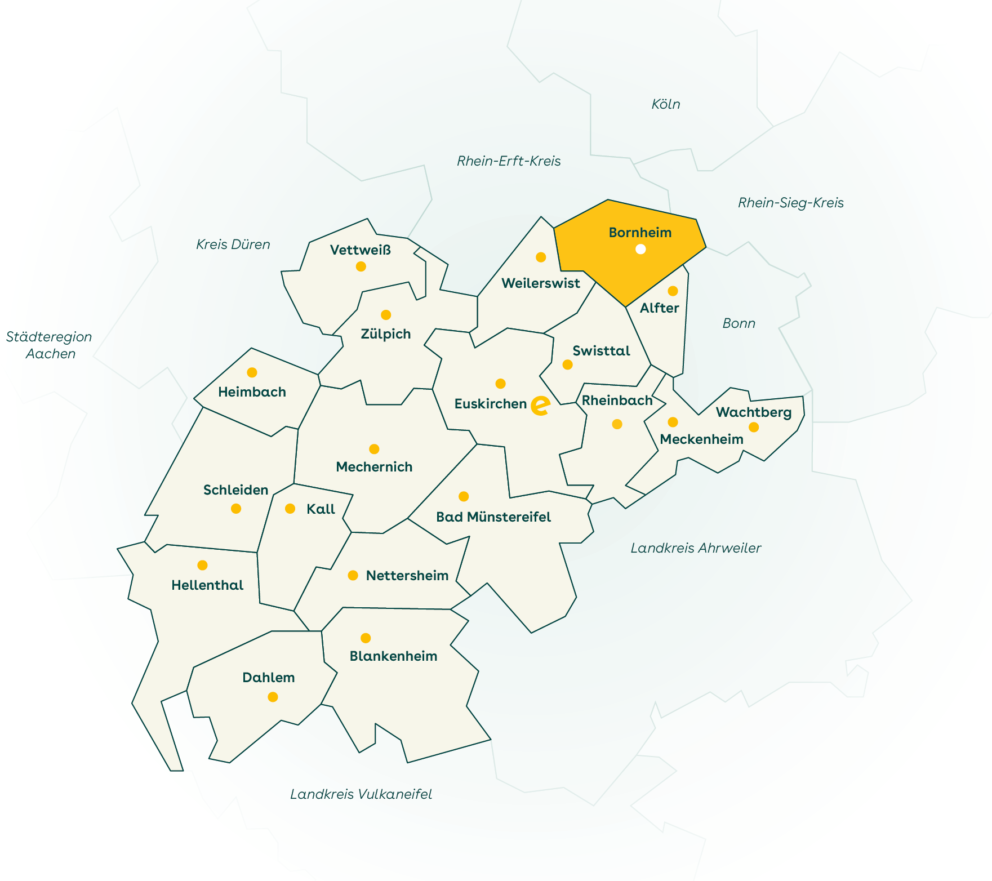 e-regio ist Ihr verlässlicher regionaler Anbieter für Solar in Bornheim und im ganzen Rhein-Sieg-Kreis. Wir kennen uns hier aus – und wir sind hier aktiv. Mit Ladestationen für Elektroautos, mit nachhaltigen Energielösungen für Haushalte und Kommunen. Seit über 90 Jahren sind wir zwischen Rhein und Eifel verwurzelt. In zwei Kundencentern in Ihrer Nähe sind wir persönlich für Sie da.